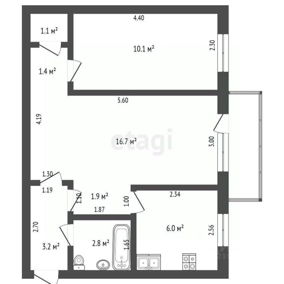 общая площадь - 43.2 м2, жилая площадь - 26.8 м2, площадь кухни - 6 м2;