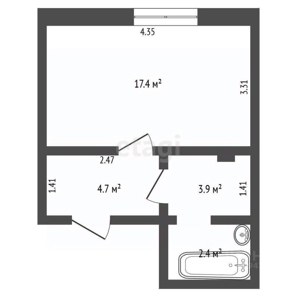 общая площадь 28.9 м2, жилая 17.7 м2, кухня 3,9 м2;