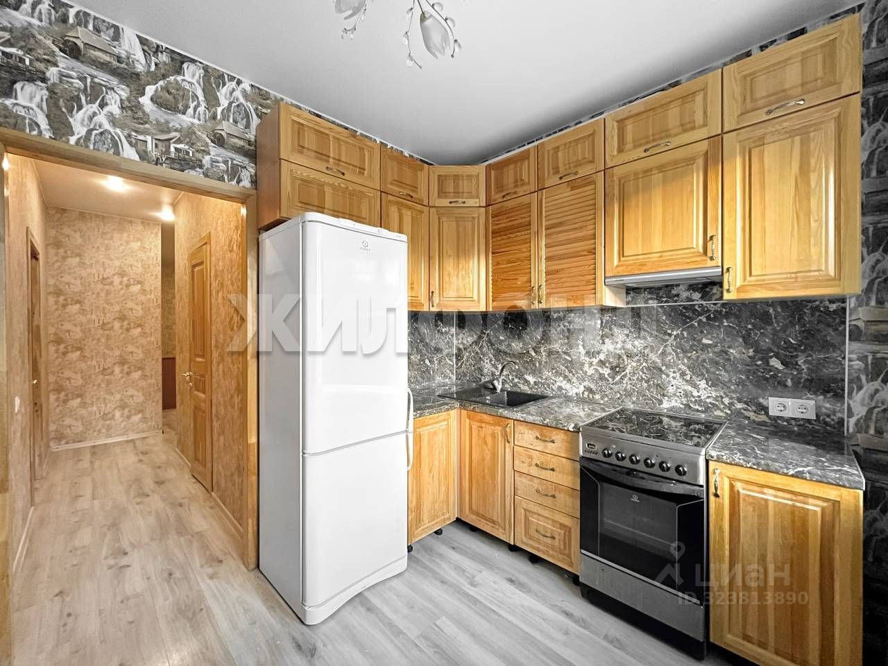 В кухне остается встроенный гарнитур из массива сосны, вытяжка, электроплита с духовкой, стол, холодильник.
