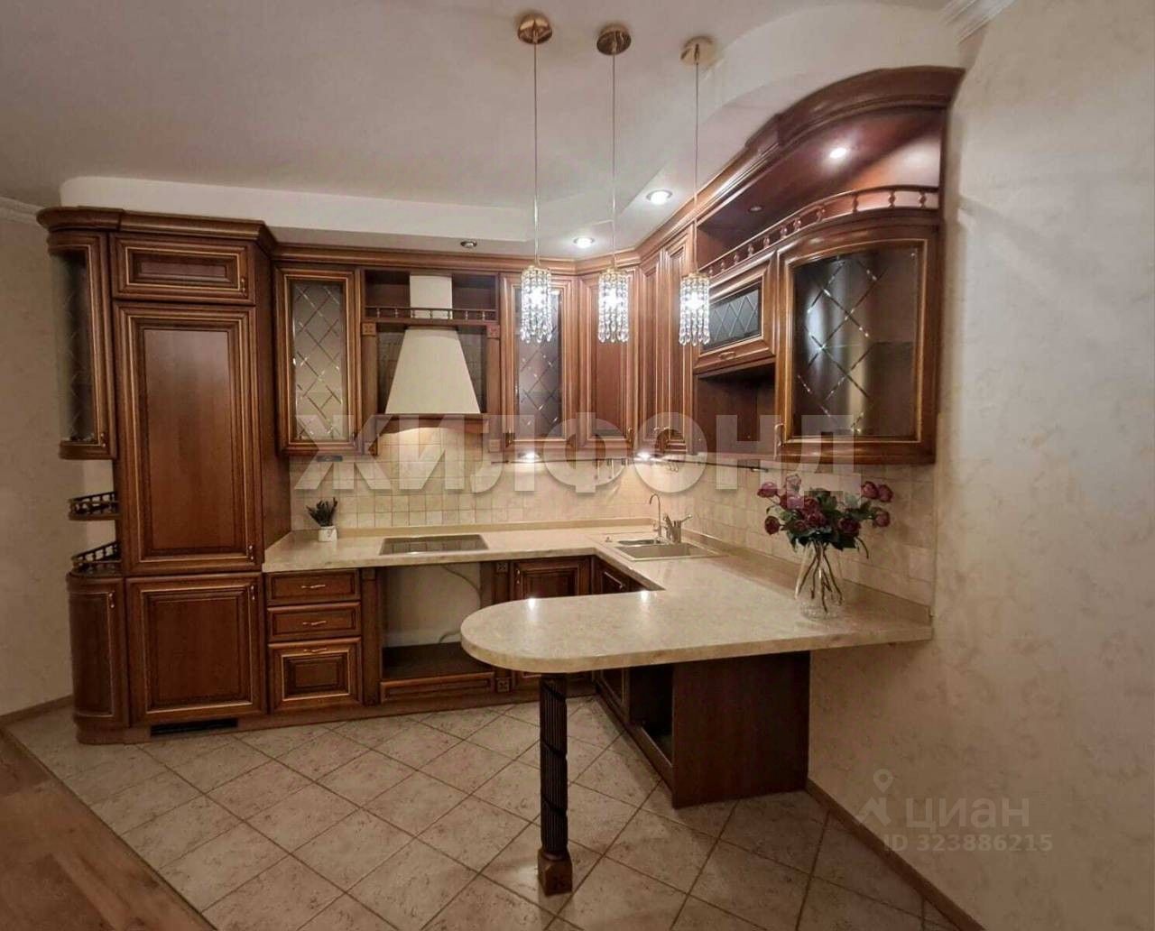* кухня-гостиная - 27 м2, встроенная мебель из массива фирмы верона (вытяжка и электрическая варочная панель остаются, предусмотрены места для холодильника и посудомоечной машины) , столовая группа (стол и стулья) в классическом стиле также остаются новым владельцам.