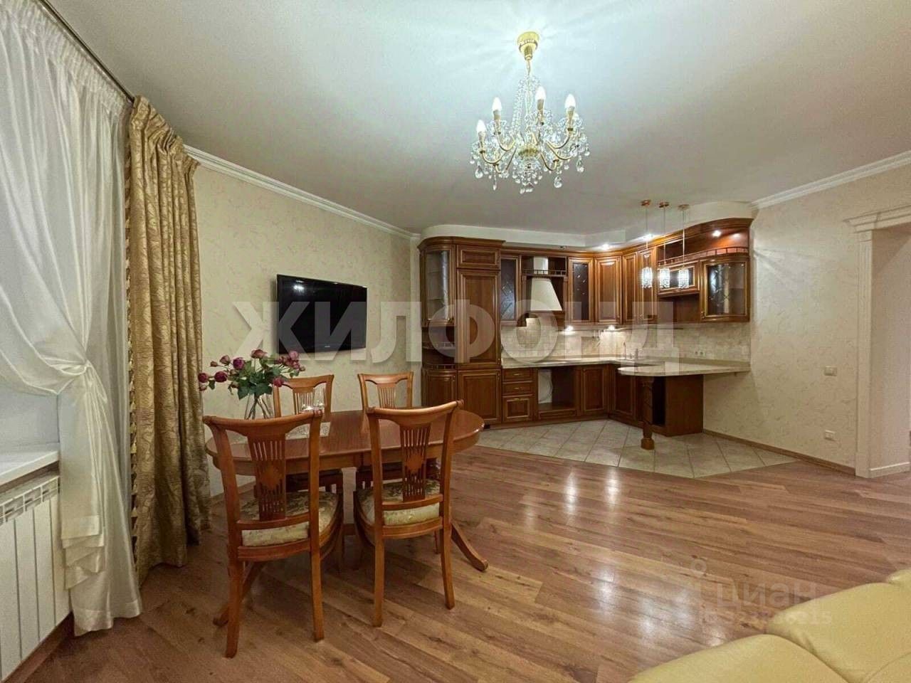 * кухня-гостиная - 27 м2, встроенная мебель из массива фирмы верона (вытяжка и электрическая варочная панель остаются, предусмотрены места для холодильника и посудомоечной машины) , столовая группа (стол и стулья) в классическом стиле,также остаются новым владельцам.