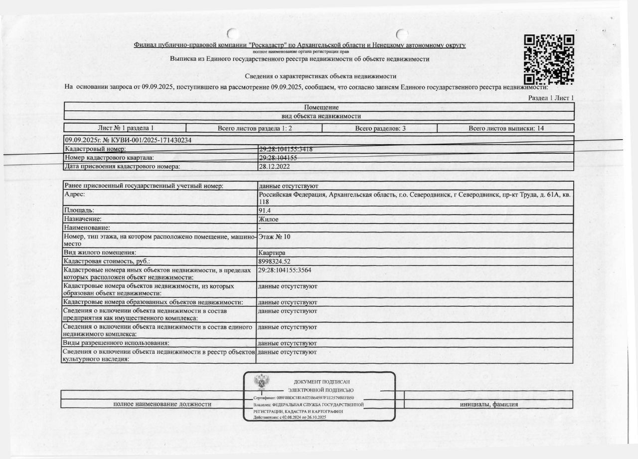 Жилое помещение (квартира) общей площадью 91, 4 кв. м, кадастровый номер: 29:28:104155:3418, адрес: Архангельская обл., г. Северодвинск, пр-кт Труда, д. 61А, кв. 118 1 Штука (шт)