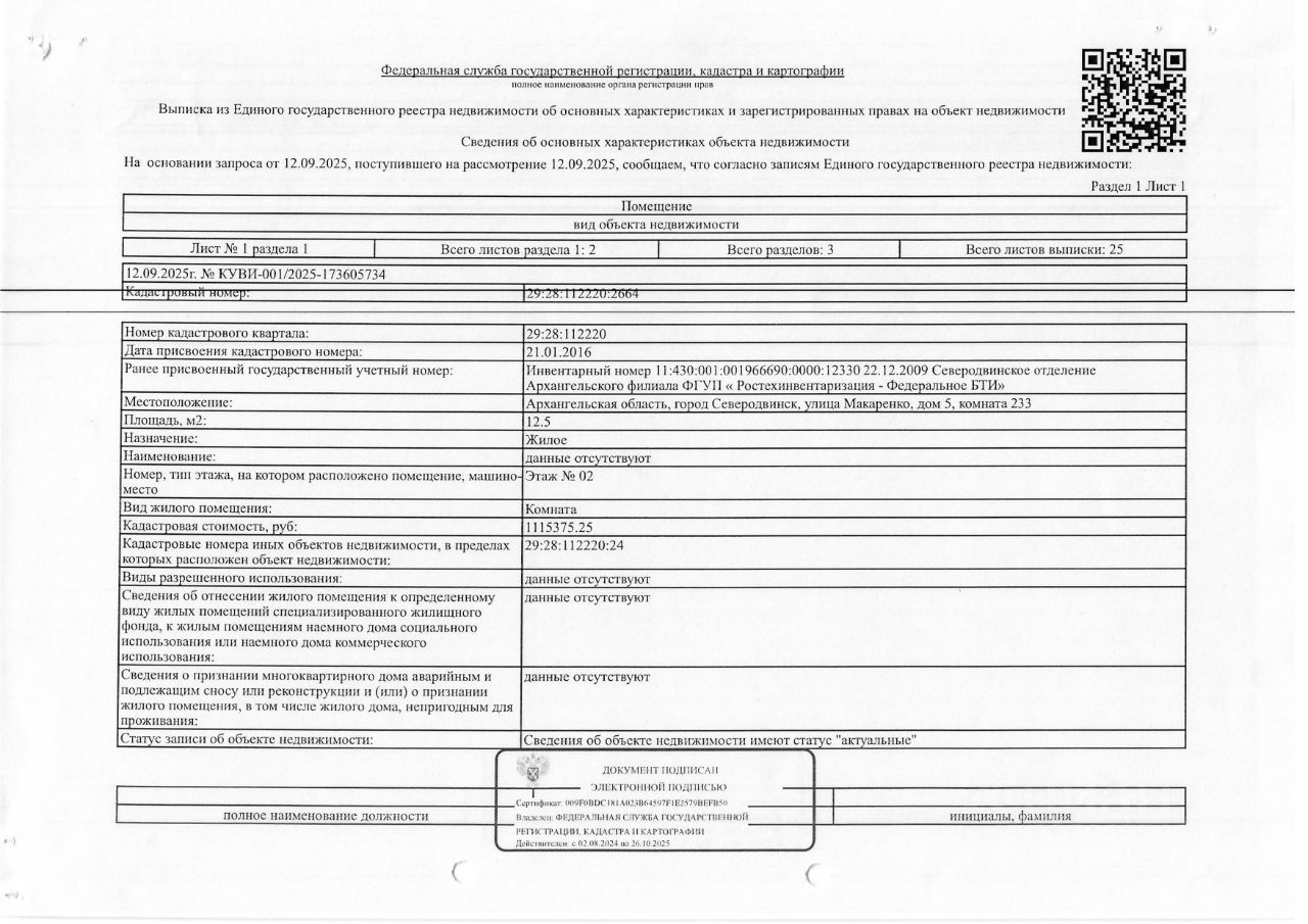 Жилое помещение (комната) общей площадью 12,5 кв. м, кадастровый номер: 29:28:112220:2664, адрес: Архангельская обл., г. Северодвинск, ул. Макаренко, д. 5, комн. 233. (реализация с учетом п. 1 ст. 353, ст. 460 ГК РФ).1 Штука (шт)