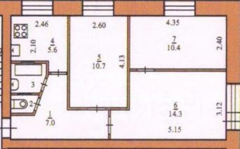 Квартира в жилом состоянии, площадь 51,2 кв.м, жилая 35,4 кв.м (комнаты 14,3+10,4-10,7 кв.м), кухня 5,6 кв.м, окна выходят на разные стороны дома!