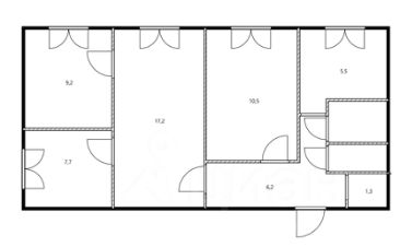 Квартира в хорошем состоянии, площадь 60,8 кв.м, жилая 44.6 кв.м (комнаты 17,2+10,5-9,2-7,7 кв.м), кухня 5.5 кв.м, имеется кладовая.