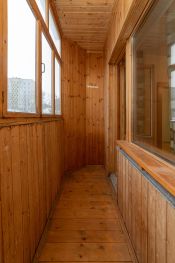 — застеклённый балкон, внутри обшит деревом — идеальное место для отдыха или хранения;