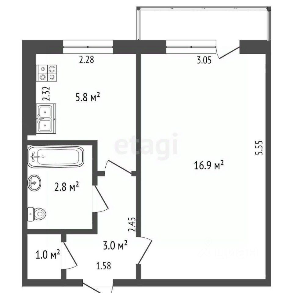 Однокомнатная квартира площадью 32 кв. м расположена на третьем этаже пятиэтажного дома по улице Двинская, 36.