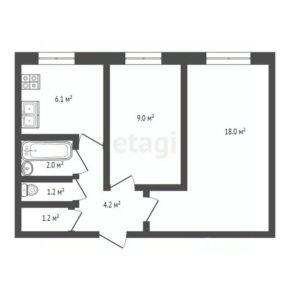 Общая площадь 42.6 м², раздельные комнаты площадью 18 и 10 кв.м.