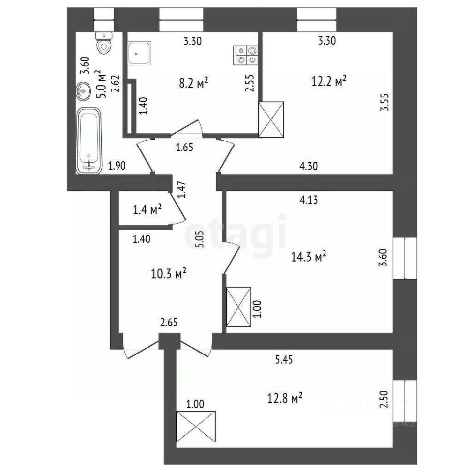 Общая площадь квартиры составляет 64.2 кв.м, кухня 8.2 кв.м.