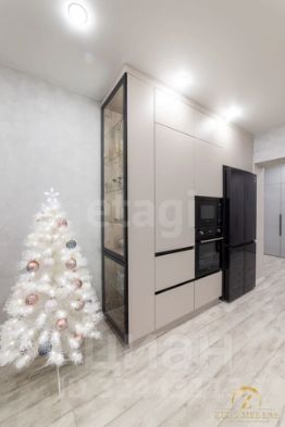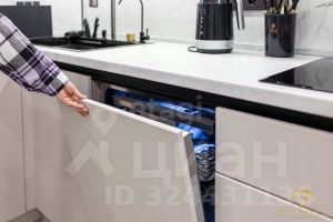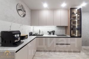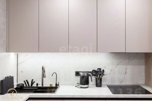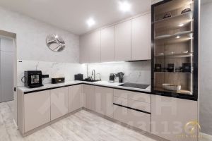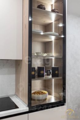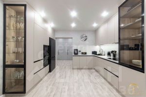 В кухне-гостиной кухонный гарнитур с подсветкой и встроенной техникой: встраиваемая посудомоечная машина полноразмерная (60 см), духовой шкаф, СВЧ-печь, варочная поверхность, вытяжка, холодильник четырехдверный. Кухня-гостиная оснащена кондиционером.