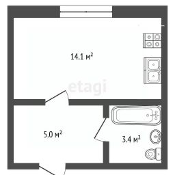 Сделана удобная планировка, жилая комната, площадью 14.1 кв.м. и отдельно прихожая, площадью 5 кв.м, санузел - 3,4 кв.м.