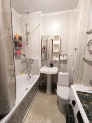 По всей квартире сделан свежий ремонт, установлены натяжные потолки, на полу влагостойкий ламинат, в ванной кафельная плитка, стены в панелях, большое пластиковое окно с широким подоконником.