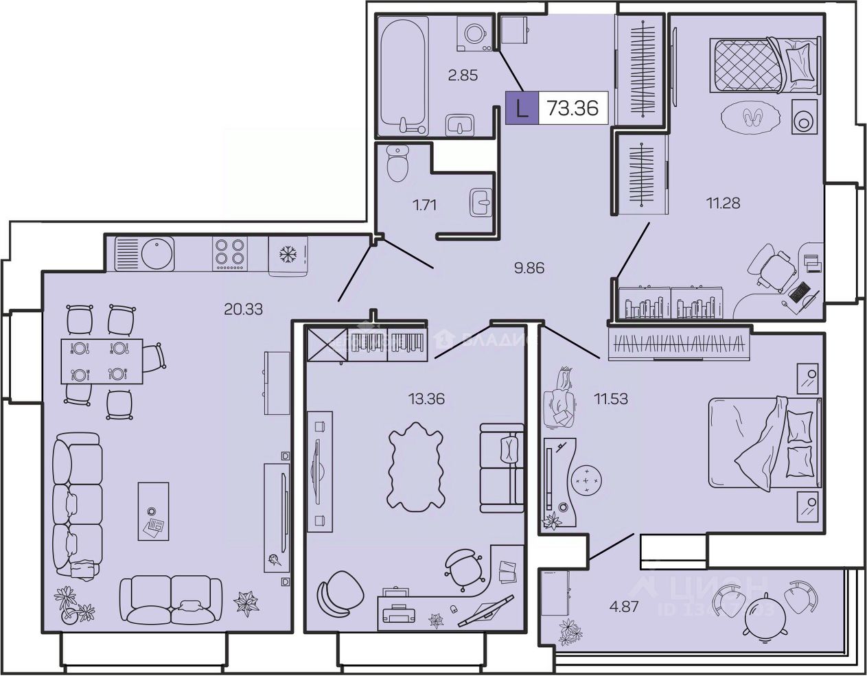 Квартира расположена на 13 этаже 16-этажного дома. Общая площадь квартиры составляет 73,36 кв.м, из которых 36,17 кв.м — жилая площадь, а 20,33 кв.м занимает кухня-гостиная. В квартире раздельный санузел. Просторная площадью 4,87 кв.м с панорамным остеклением лоджия имеет выход из одной из комнат. Высота потолков — 2,7 метра. Окна выходят во двор, что обеспечит тишину и покой. В квартире выполнен ремонт white box, благодаря чему вы сможете оформить интерьер по своему вкусу.