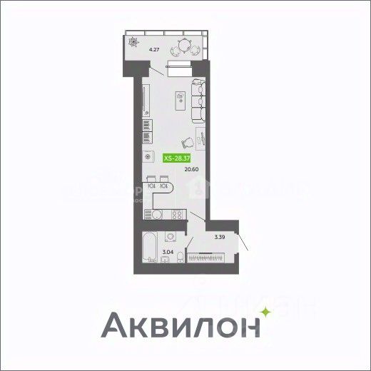 Квартира расположена на 9 этаже, имеет общую площадь 28,37 квадратных метров, из которых 15,6 кв. м занимает жилая площадь, а 5 кв. м отведено под кухню. Высота потолков — 2,7 метра. Большие окна выходят на улицу. Студия угловая, с большим балконом с панорамным остеклением. В квартире выполнен ремонт white box, что позволяет сразу приступить к финишной отделке помещения по своему вкусу. Чистовую можно заказать прямо у застройщика.