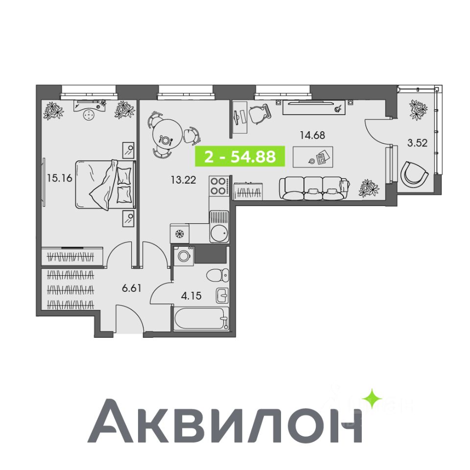 Общая площадь54,88 м²