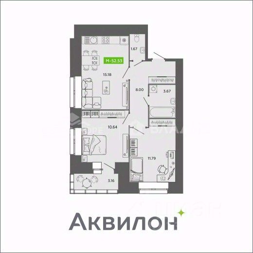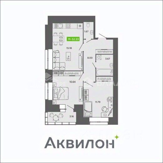 Квартира расположена на 4 этаже 11-этажного дома первого корпуса ЖК "RIVER PARK-2". Общая площадь — 52,53 м², жилая площадь — 22,43 м² (две комнаты площадью 10,64 м² и 11,79 м² ), площадь кухни — 15,18 м². Высота потолков — 2,7 метра. Окна выходят во двор. Имеется одна лоджия с панорамным остеклением. Раздельный санузел. В квартире выполнен ремонт white box, что позволяет воплотить любые дизайнерские идеи. Чистовую отделку можно заказать прямо от застройщика.
