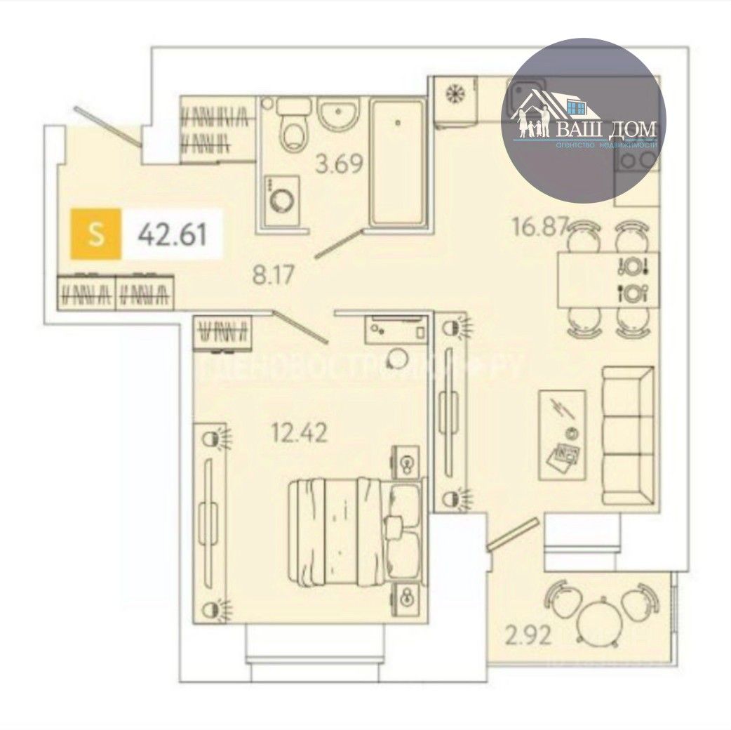 - Гостиная совмещённая с кухней (16,87 м2) с выходом на балкон (3 м2) с панорамным остеклением - готовая релакс-зона.