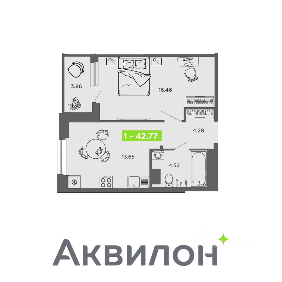 Общая площадь42,77 м²
