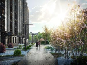 Благоустройство: разновозрастные детские площадки с антитравматическим покрытием, зона street workout: уличные тренажеры и турники, велопарковки, зоны отдыха со скамейками, озеленение территории, малые архитектурные формы.