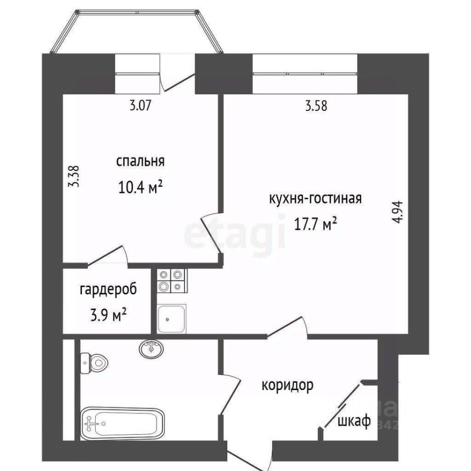 При продаже остаётся встроенный кухонный гарнитур, шкаф-купе в прихожей