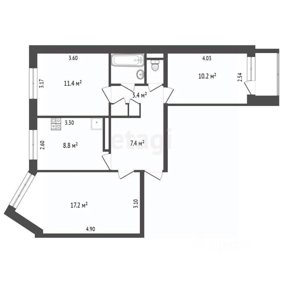 * Комнаты — 11,4 кв. м, 10,2 кв. м (с выходом на застекленную лоджию)