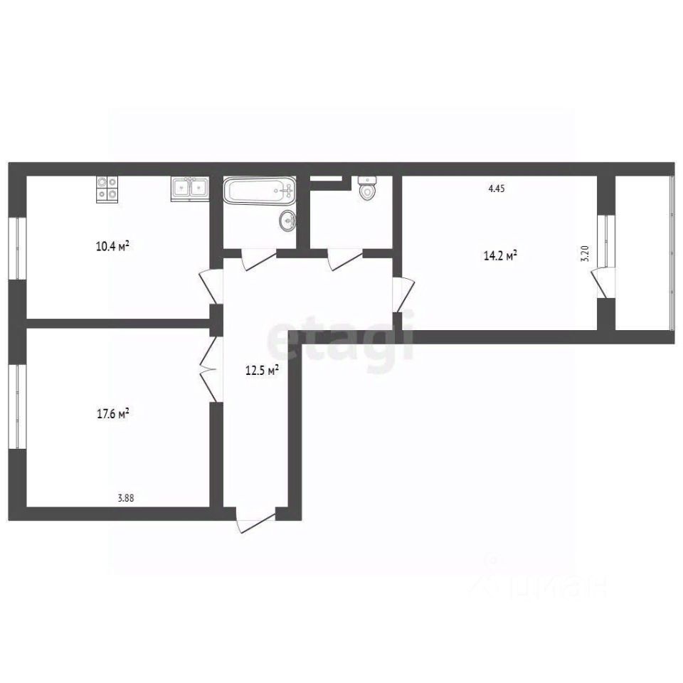 Площадь квартиры 59,7 кв.м., просторная кухня 12 кв.м., комнаты 17 и