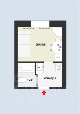 В эргономичном пространстве отведено место для всего необходимого: зона прихожей, кухня, душ, туалет. В жилой комнате помещается стандартного размера диван, небольшой шкаф, стол, холодильник и стеллаж.