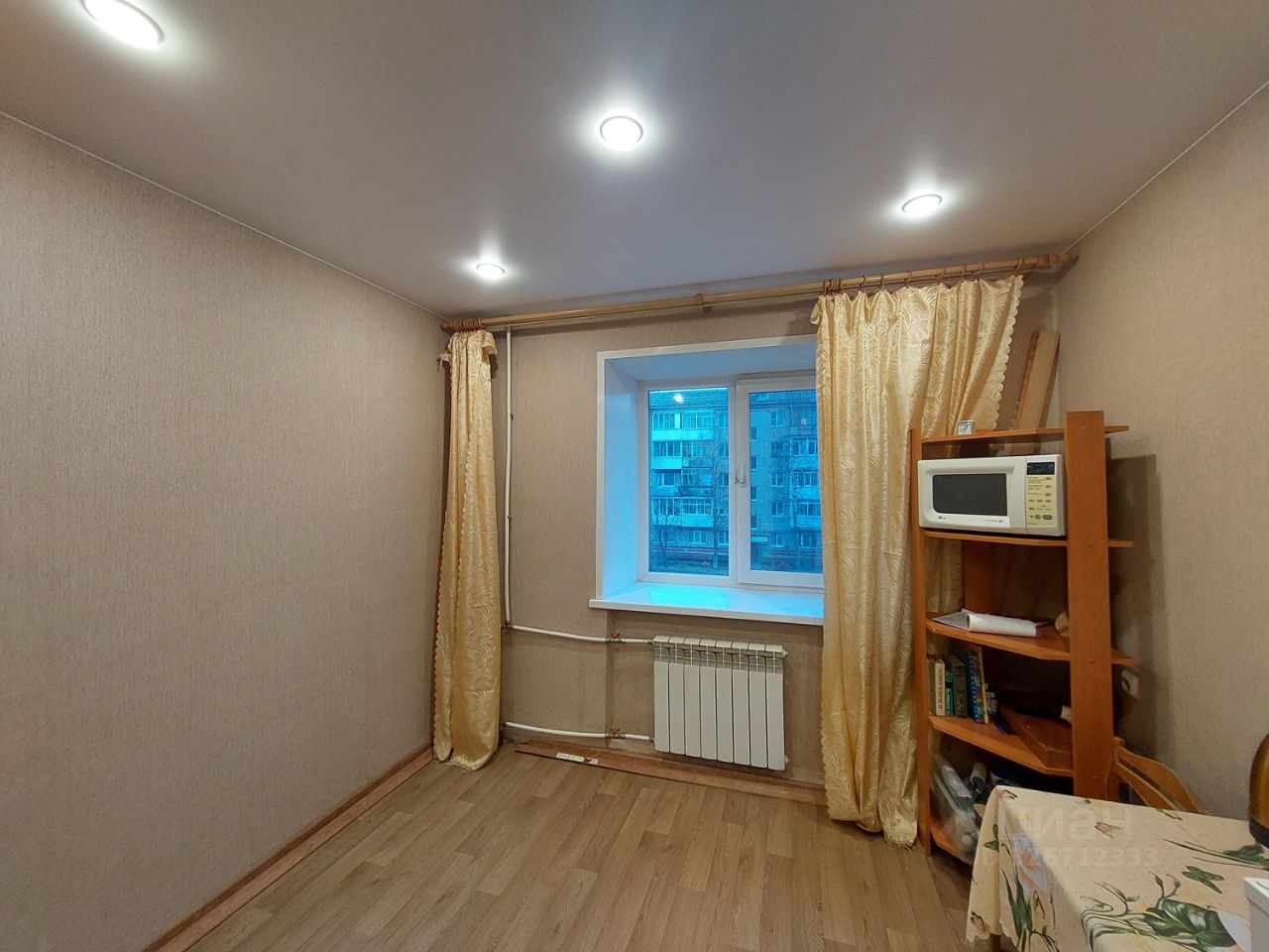 - в комнате и прихожей натяжные потолки с точечными светильниками, на полу линолеум, стены выровнены, оклеены обоями;