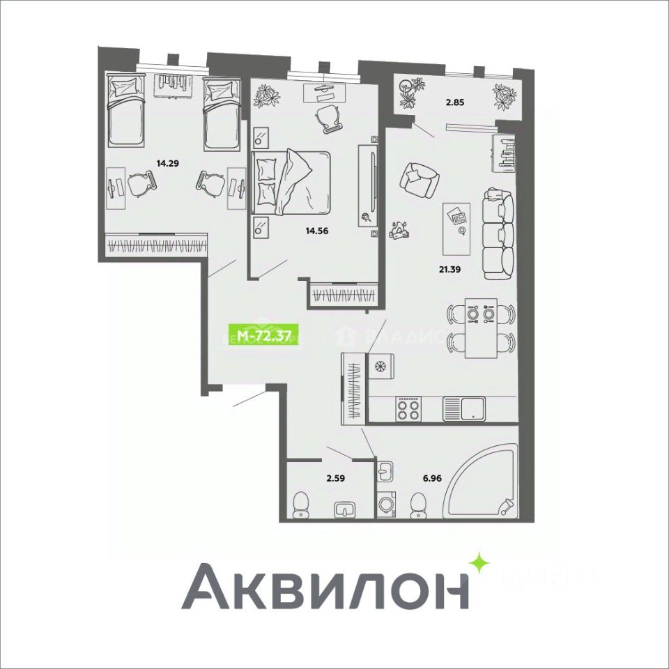 Квартира располагается на 4 этаже 4-этажного кирпично-монолитного дома. Общая площадь квартиры - 72,37 м². Две комнаты площадью 14,56 м² и 14,29 м², кухня-гостиная - 21,39 м². В кухне-гостиной есть место для установки камина. Высокие потолки 3м. Окна выходят на Обводный канал. Квартира сдается без отделки, свободной планировки.