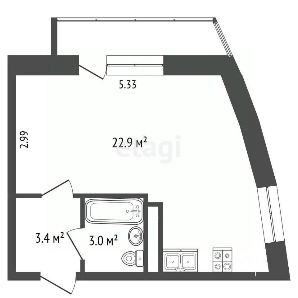 Планировка включает полноценный просторный балкон на солнечной стороне, который можно обустроить как комфортную зону для отдыха. Квартира предлагается в черновой отделке, с двумя окнами, что дает возможность разделить студию по зонам и полную свободу для реализации любых дизайнерских решений в соответствии с вашими предпочтениями.