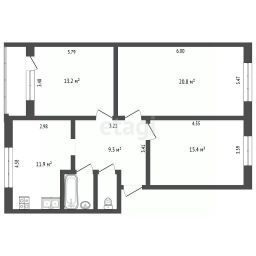 Просторная трехкомнатная квартира площадью 75,4 м² расположена в двухэтажном деревянном доме из бруса 2008 года постройки в центральной части города.