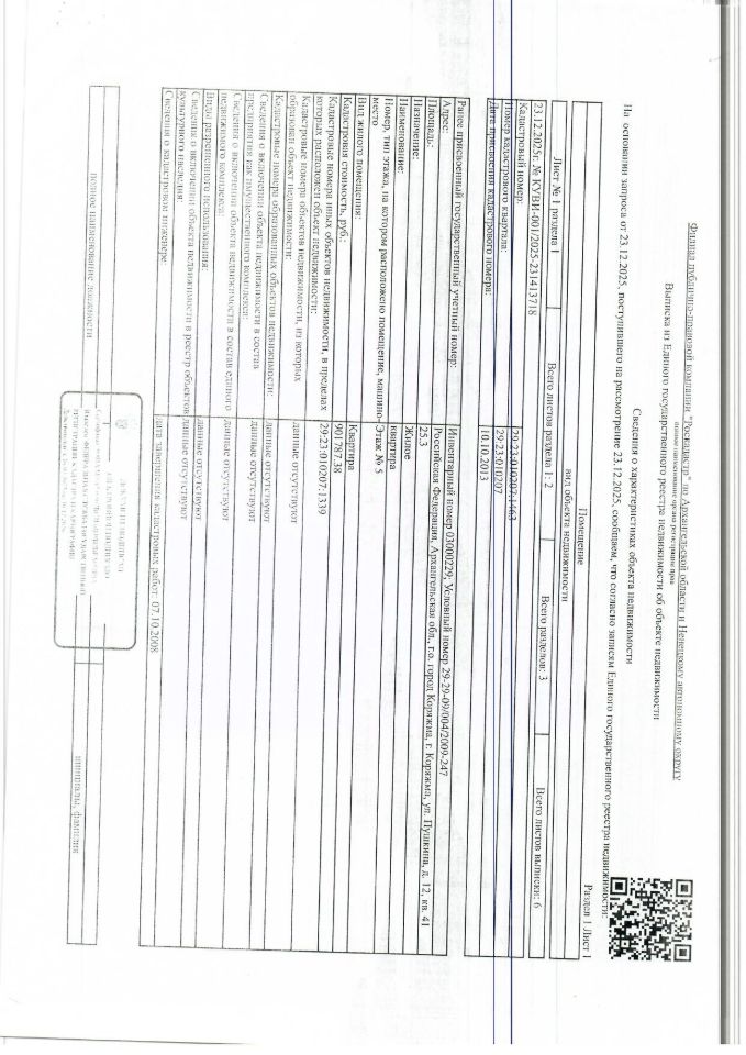 Жилое помещение (квартира) общей площадью 25,3 кв. м, кадастровый номер: 29:23:010207:1463, адрес: Архангельская обл., г. Коряжма, ул. Пушкина, д. 12, кв. 41 1 Штука (шт)