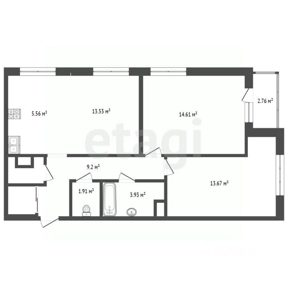Две полноценные комнаты отлично подойдут для семьи с детьми. А кухня-гостиная с кухней-нишей общей площадью 19,09 м2 станет вашим любимым местом.