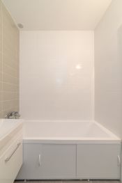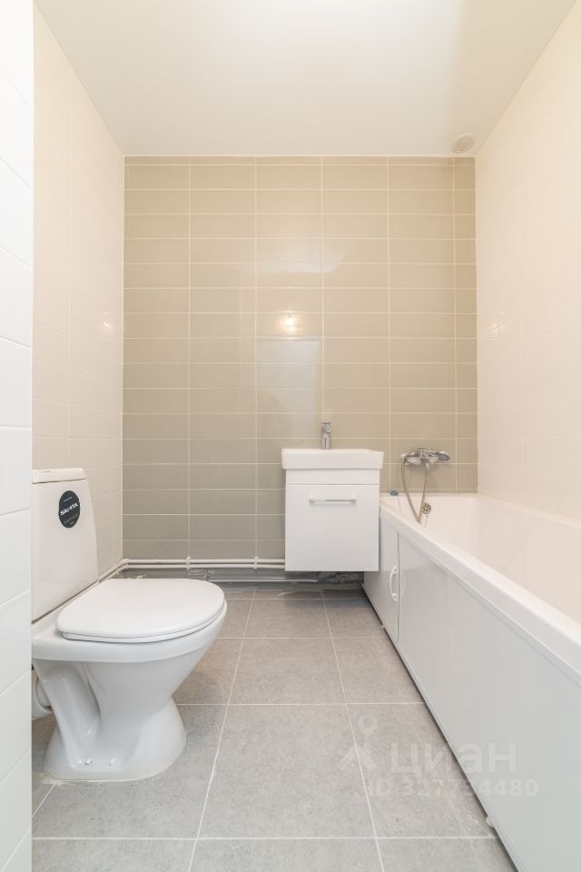 Полностью оборудованная ванная: ванна, раковина, унитаз.