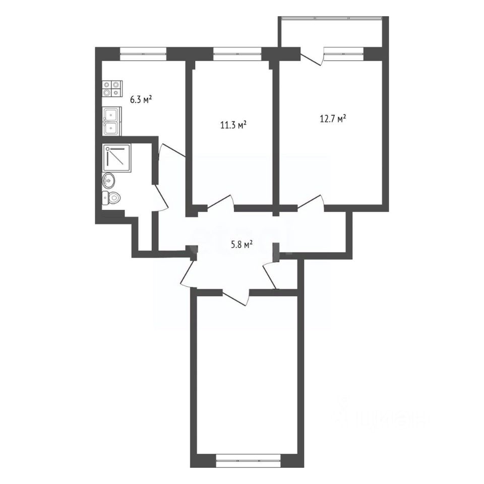 Квартира с удобной планировкой: все комнаты изолированные, окна на разные стороны, есть застеклённый балкон.