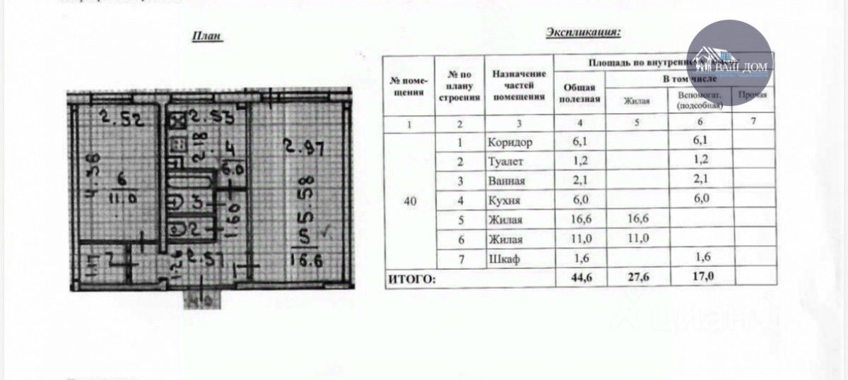 Общая площадь квартиры — 44.6 кв.м, идеальная для комфортной жизни. Изолированная планировка и жилая площадь в 27.6 кв.м предоставят вам возможность наслаждаться личным пространством и уютом.