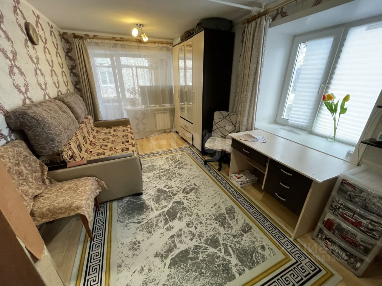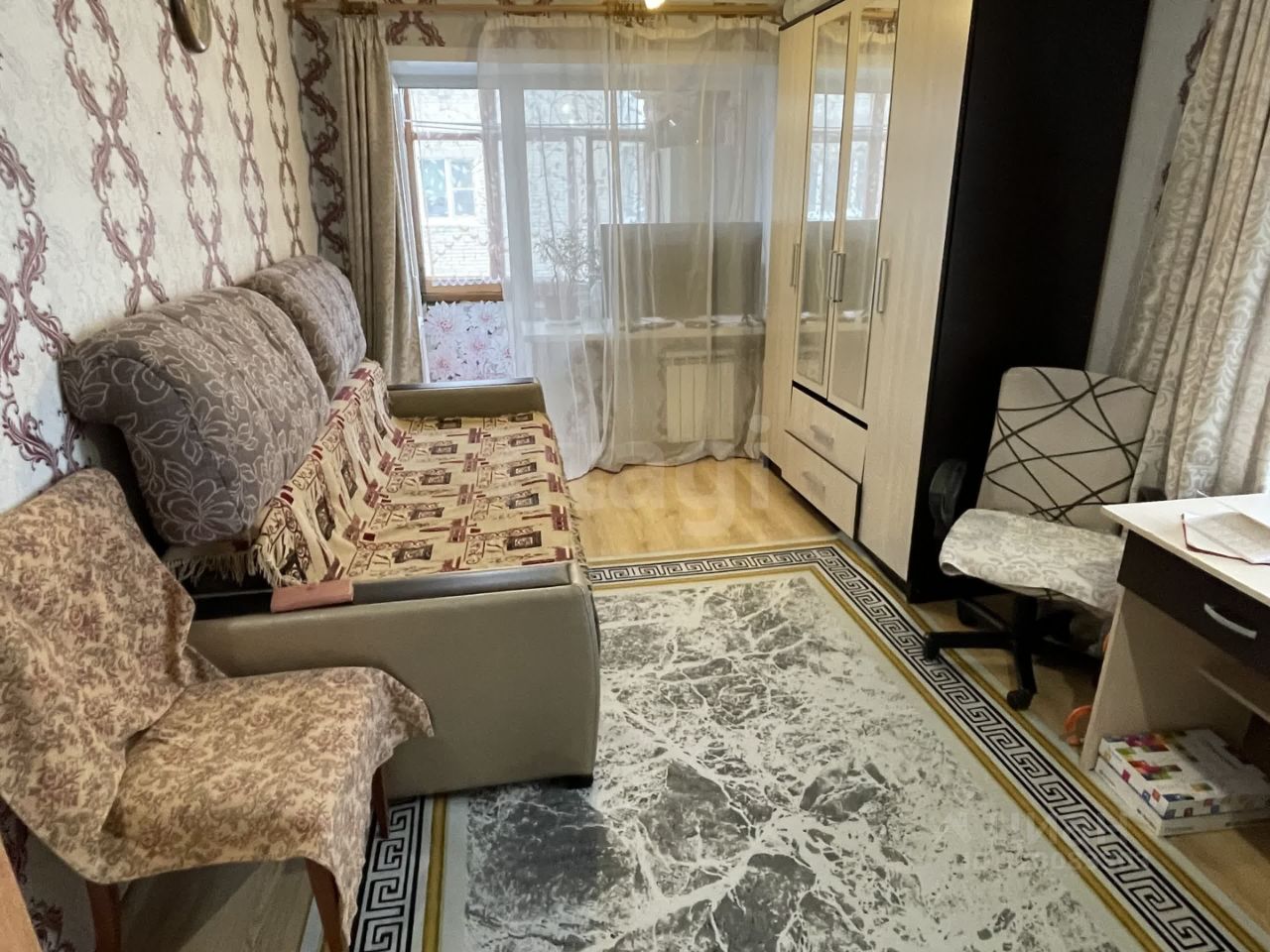 Светлую комнату с выходом на застеклённый балкон. Уже есть вся нужная мебель: Можно сразу обустроиться и жить!