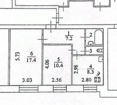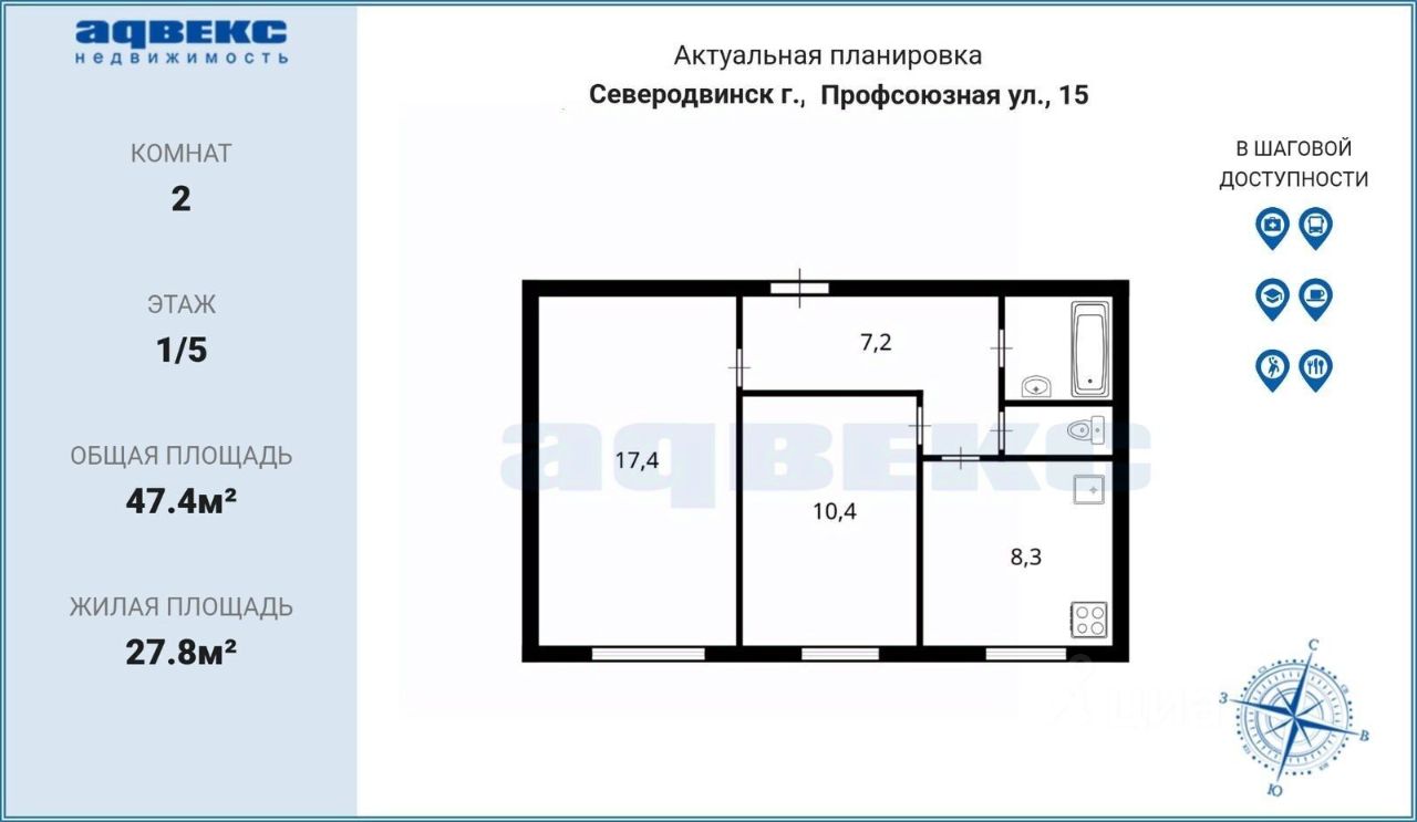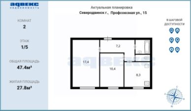 Общая площадь квартиры 47,4 квадратных метра, две изолированные комнаты площадью 10,4 и 17,4 кв. м. Кухня 8,3 кв. м. Санузел раздельный. Окна выходят во двор на солнечную сторону, что обеспечивает тишину и спокойствие, в квартире светло.