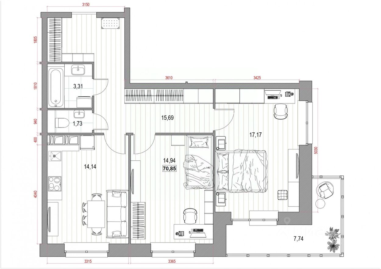 Общая площадь70,85 м²