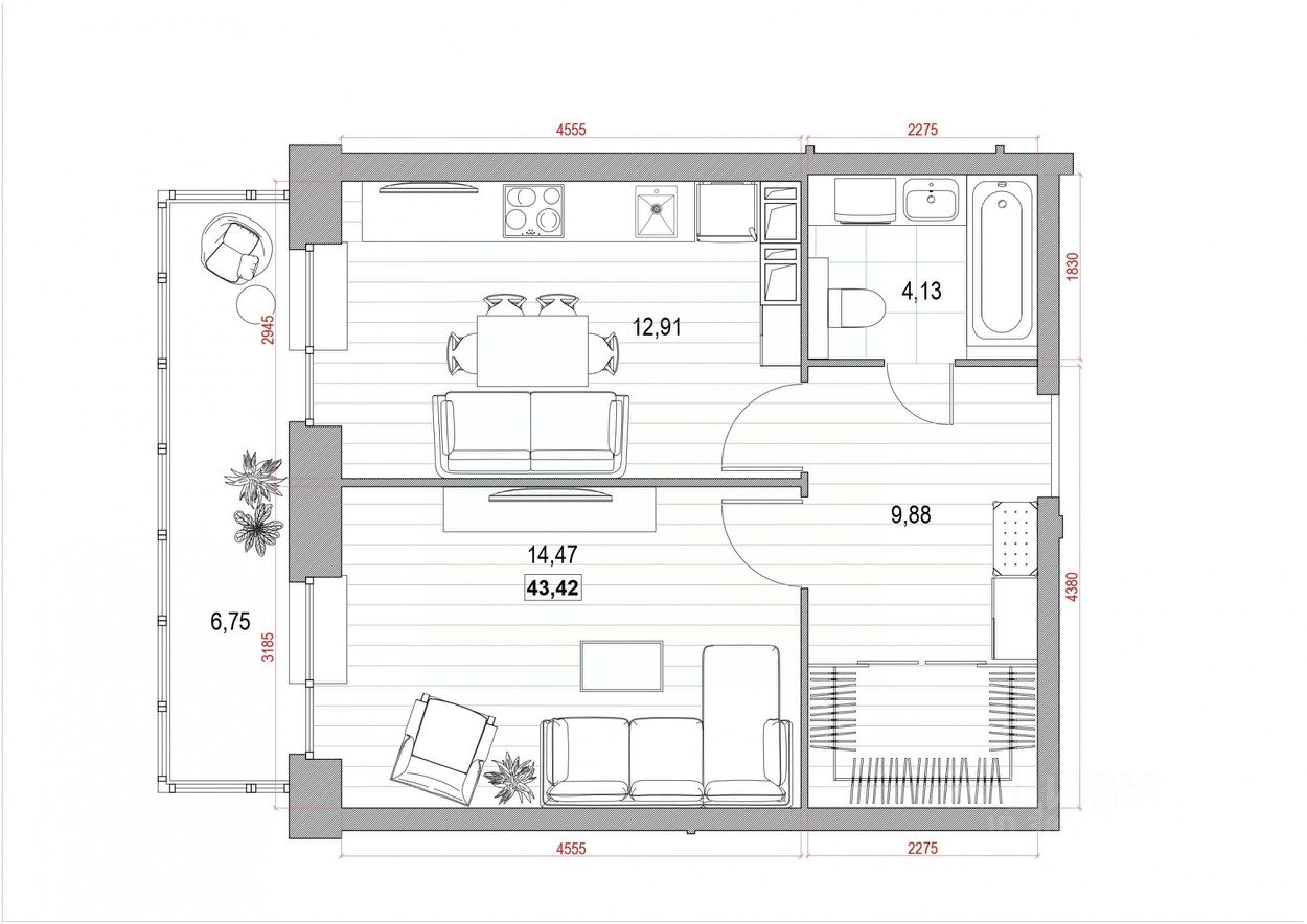Общая площадь43,42 м²