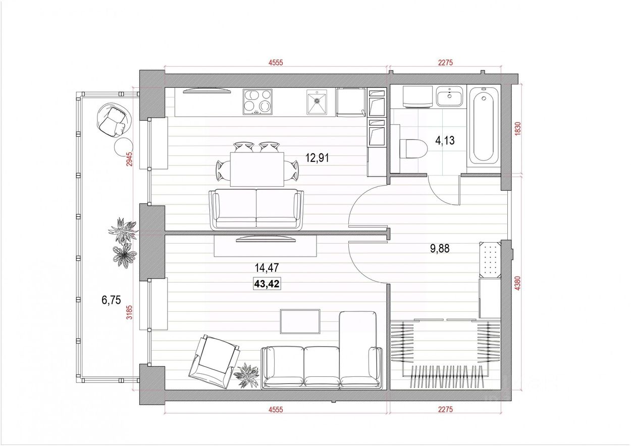 Общая площадь43,42 м²