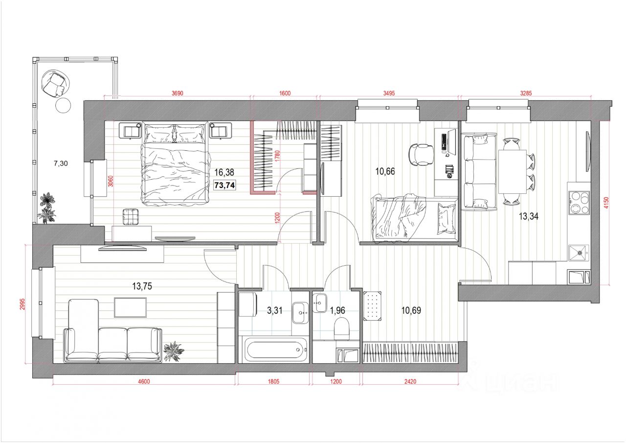 В квартирах высокие потолки от 2,8 до 3 метров. Все балконы застеклены. Будут выполнены самые грязные и тяжелые работы: заливка полусухой стяжки вместе со слоем керамзита для тепло- и звукоизоляции, установка межкомнатных стен.