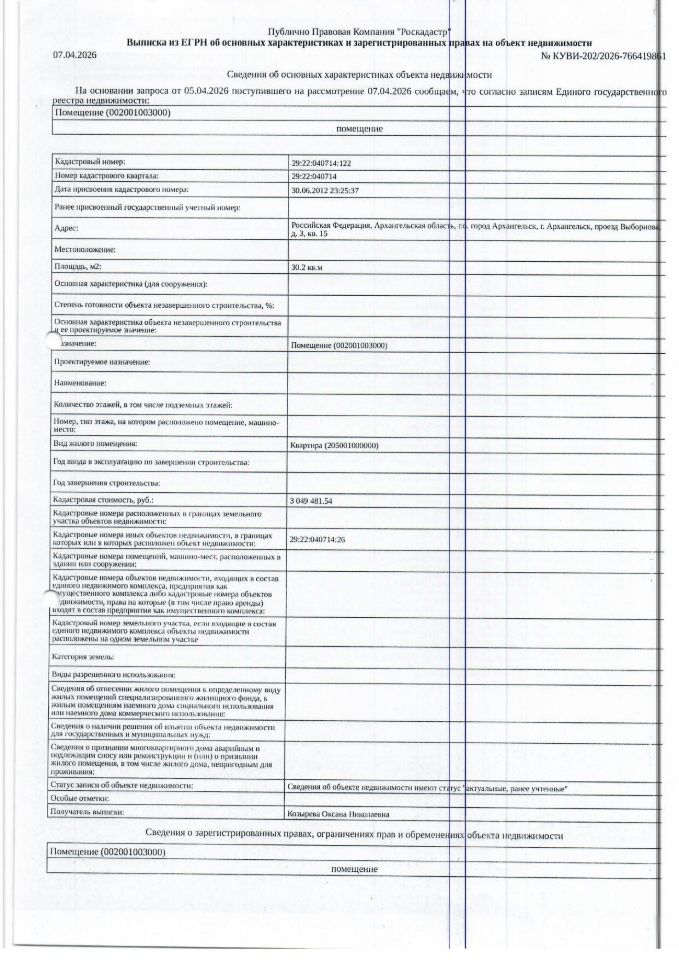 Жилое помещение (квартира) общей площадью 30,2 кв. м, кадастровый номер: 29:22:040714:122, адрес: г. Архангельск, проезд Выборнова, д. 3, кв. 15 1 Штука (шт)