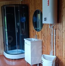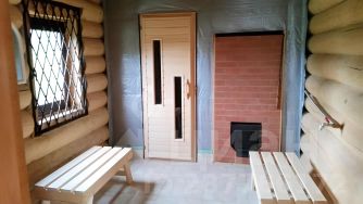- Банно-гостевой дом 70,4 м2 из зимнего бревна ручной рубки диаметром 26-28 см. Обработан пропитками, грунтовкой, окрашен финской краской. Отопление - камин с изразцами и чугунной итальянской топкой, электрические обогреватели. На веранде, моечной, парилке - кафель с подогревом. В моечной душ, раковина.