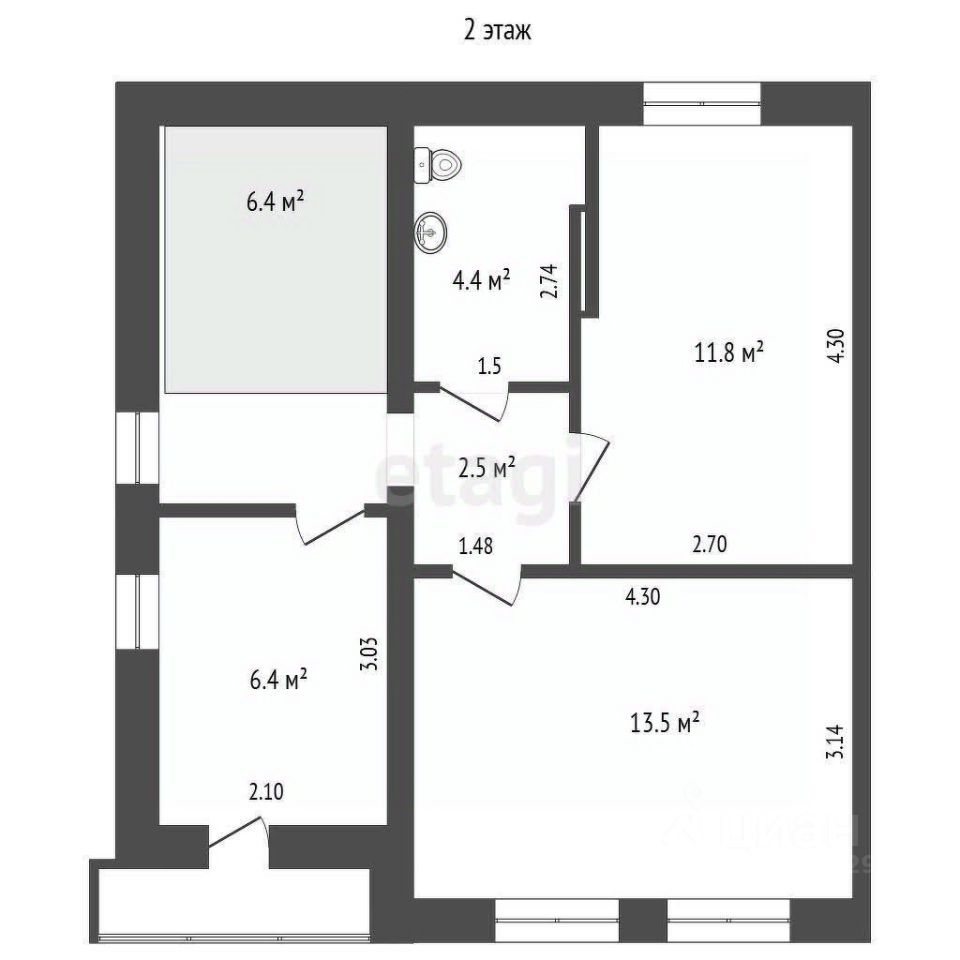 На втором этаже три изолированные комнаты площадью 11,8, 13,5 и 6,4 кв. м, застекленным балконом и вторым санузлом.