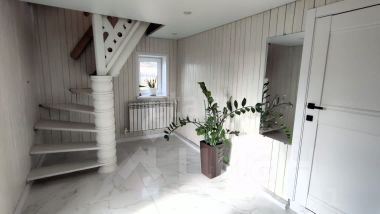 Отделка выполнена в приятных светлых тонах: первый этаж — современный стиль, санузел обшит деревом, второй и третий этаж — полностью деревянная отделка.