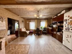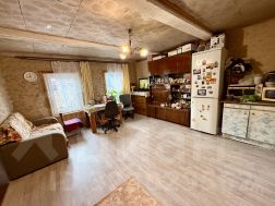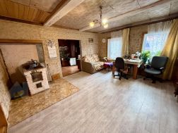 Общая площадь 100 м2. Гостиная-кухня 16 м2, три комнаты 11; 19,4 и 13,2 м2. Прихожая 23 м2, обшита вагонкой. Пристроено крыльцо с окнами около 20 м2. Печное отопление, печь из кирпича, стоит на своем фундаменте. Рядом с участком находится колонка, есть возможность завести центральное водоснабжение в дом.