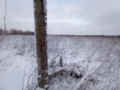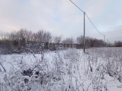 Участок имеет прямоугольную форму и расположен на второй линии от дороги. На границе участка проходят столбы с электричеством.