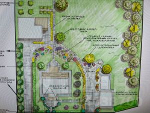 Полностью распланирован, отсыпан песком, сделаны дорожки из кирпича.