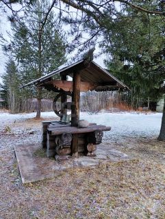 дополнительную постройку, вместительный гараж, резной колодец, пруд,